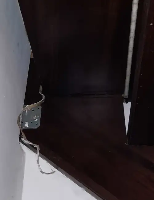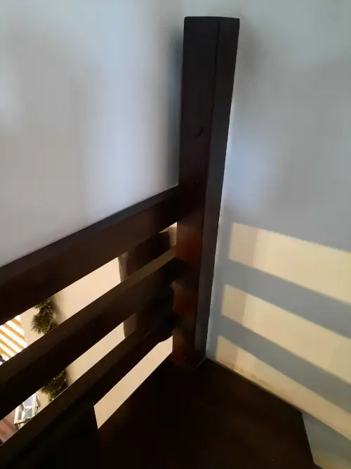 Słupek przykręcony już do ściany a druga strona wangi na kątownik do elementu konstrukcyjnego domu.